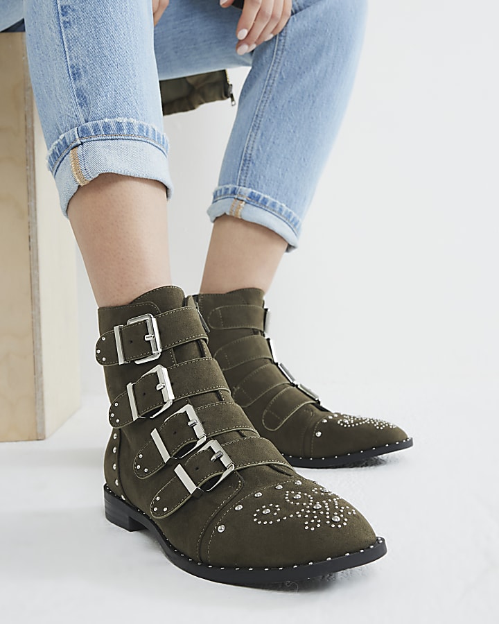 Khaki Suedette Stud Buckle Boots River Island Very well made.