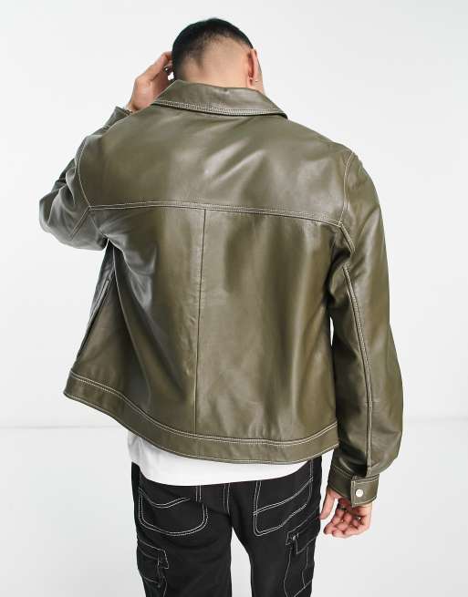 ASOS DESIGN harrington leather jacket in green with contrast stitch Very well made.