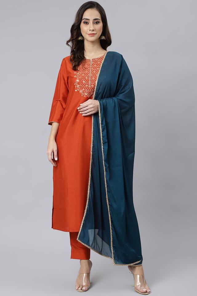 Buy JANASYA Orange Solid Silk Round Neck Women s Salwar Suit Shoppers Stop Very well made.